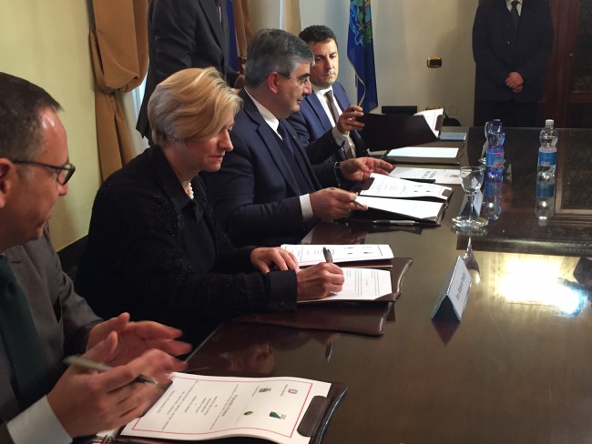 Caserma Di Cocco Pescara: la firma del ministro Pinotti insieme a quelle del Direttore del Demanio Reggi, di D’Alfonso e Alessandrini per la consegna alla città dello storico edificio.