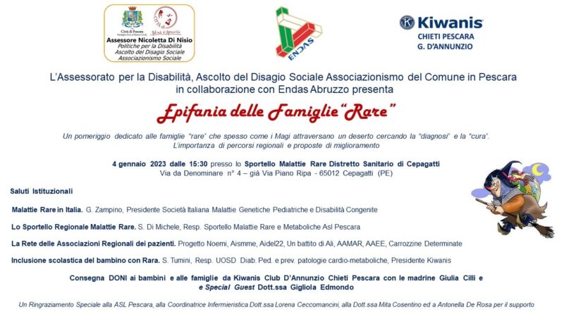 L’evento avrà inizio alle ore 15.30 ed è promosso dall’Assessorato alla Disabilità, Associazionismo e Disagio Sociale del Comune di Pescara, diretto da Nicoletta Di Nisio e da ENDAS Abruzzo APS, a supporto delle attività dello Sportello Regionale delle Malattie Rare della ASL Pescara – UOC Pediatria, diretta da Maurizio Aricò, con il patrocinio della SIMGePeD, la Società Italiana Malattie Genetiche Pediatriche e Disabilità Congenite.