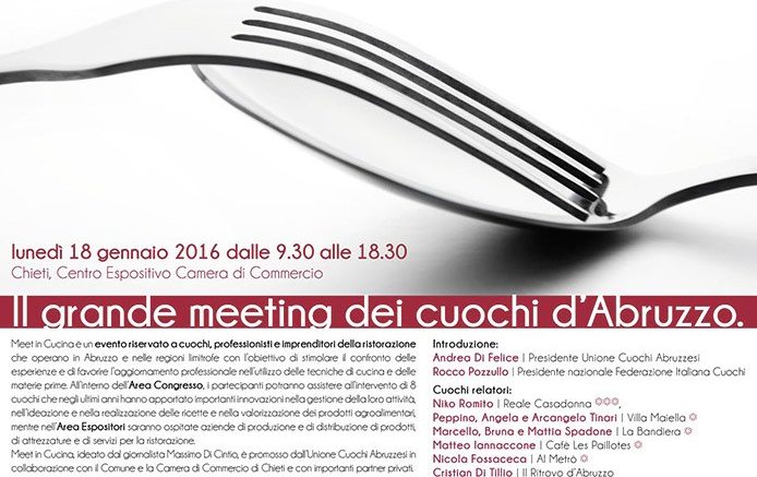 L’ideatore della manifestazione Massimo Di Cintio e il presidente dell’Unione cuochi abruzzesi Andrea Di Felice la seconda edizione di ” Meet in cucina2 è una “no stop” di oltre nove ore “con l’obiettivo di favorire l’aggiornamento professionale degli operatori della ristorazione, il trasferimento delle esperienze di cucina per migliorare la qualità dell’offerta gastronomica”.
