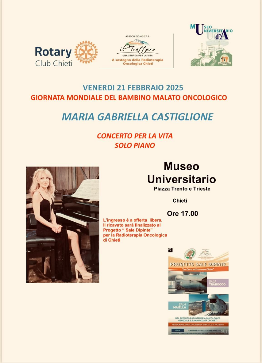 Oggi, alle ore 17, nell’auditorium del Museo Universitario di Chieti, concerto per pianoforte della pianista Maria Gabriella Castiglione per sostenere il progetto ‘Sale dipinte’ dell’Associazione ETS ‘Il Tratturo una strada per la vita’