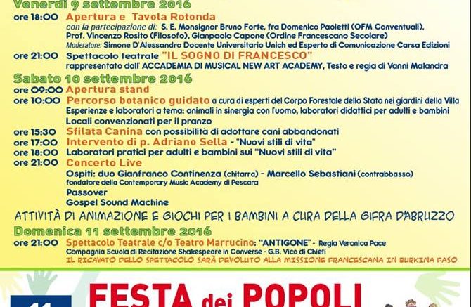 L’evento, da venerdì a domenica presso la Villa Comunale, caratterizzato da incontri, ma anche da momenti di animazione ed intrattenimento e vede la collaborazione anche della Consulta dei Laici di Chieti e della Diocesi di Chieti – Vasto. San Francesco d’Assisi è universalmente riconosciuto “amico della natura” e di tutte le realtà create; egli infatti non amava semplicemente la bellezza della natura, ma tutte le meravigliose realtà create da Dio, prima fra tutte l’uomo. San Francesco ci propone di riconoscere la natura come uno splendido libro nel quale il Creatore ci parla e ci trasmette qualcosa della sua bellezza e della sua bontà e usa un linguaggio nuovo che chiama fratello e sorella ogni creatura animata e inanimata. Così nel Cantico delle Creature tutto è metafora per sentirsi figli dello stesso Padre; custodire l’intero creato è avere rispetto per ogni creatura e dunque per il suo Creatore. Per diffondere il pensiero francescano fondato sui valori di fraternità, umiltà, carità e pace, ci si è affidati alla “formula Festival”: una manifestazione che permette di uscire nelle piazze, tra la gente per annunciare il Vangelo e nuovi stili di vita, incontrando e rimanendo aperti al dialogo. È anche un modo per richiamare tutti coloro che occupano ruoli di responsabilità in ambito economico, politico e sociale, alla “custodia” della creazione, al rispetto della natura e della storia dell’uomo. Ma per “custodire” dobbiamo anche avere cura di noi stessi; non solo l’inquinamento ma anche l’odio, l’invidia, la superbia, il peccato, sporcano la vita! Custodire vuol dire allora anche vigilare sui nostri sentimenti, sul nostro cuore, perché è proprio da lì che escono le intenzioni buone e cattive: quelle che costruiscono e quelle che distruggono! “Custodire e costruire” un mondo nuovo, diffondendo nuove ideologie e scelte a sostegno dell’uomo e del creato. Per noi non è solo una utopia ma una speranza, una speranza da coltivare e da attualizzare. Ci sono tante situazioni di povertà che gridano giustizia agli occhi di Dio, poiché vi sono nel nostro stesso pianeta situazioni di uomini in uno stato di miseria degradante, senza reali possibilità di miglioramento e situazioni di altri uomini che non sanno nemmeno che farsene di ciò che possiedono. Su queste riflessioni si basa il programma del Festival, che si articola in momenti filosofico-letterali (rappresentazione dell’Antigone, scuola di recitazione Shakespeare in Converse, G.B. Vico di Chieti; musical “Il Sogno di Francesco” dell’accademia di musical New Art Academy), spettacoli, concerti (Duo Gianfranco Continenza fondatore della Contemporary Music Academy di Pescara – chitarra, società San Giovanni, Gospel Sound Machine) laboratori didattici, momenti spirituali (tavola rotonda con Mons. Bruno Forte, Padre Domenico Paoletti; Nuovi Stili di Vita di Padre Adriano Sella; veglie di preghiera), momenti scientifici a sostegno di energie rinnovabili, consumo delle risorse, gruppi di acquisto solidali, produzioni a chilometro zero, bioedilizia, per concludere momenti di carattere prettamente sociale incentrati su messaggi di pace ed integrazione sociale (Festa dei Popoli) e con testimonianze di persone e/o gruppi che hanno abbracciato stili di vita più sostenibili (cooperativa sociale “Fratelli è Possibile”), oltre ad attività di animazione e giochi per bambini a cura della Gioventù Francescana d’Abruzzo.
