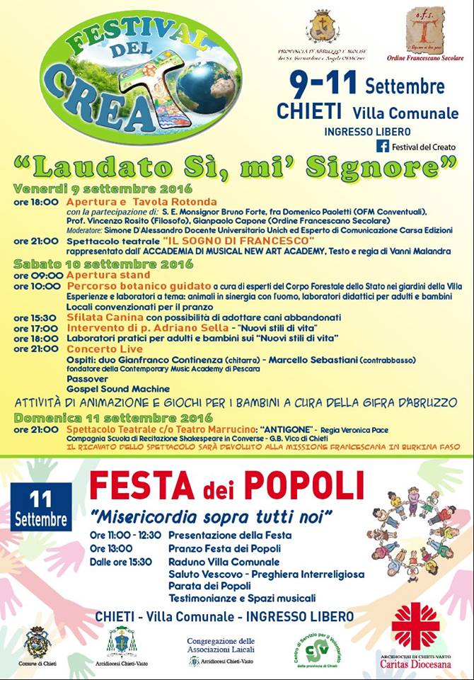 L’evento, da venerdì a domenica presso la Villa Comunale, caratterizzato da incontri, ma anche da momenti di animazione ed intrattenimento e vede la collaborazione anche della Consulta dei Laici di Chieti e della Diocesi di Chieti – Vasto. San Francesco d’Assisi è universalmente riconosciuto “amico della natura” e di tutte le realtà create; egli infatti non amava semplicemente la bellezza della natura, ma tutte le meravigliose realtà create da Dio, prima fra tutte l’uomo. San Francesco ci propone di riconoscere la natura come uno splendido libro nel quale il Creatore ci parla e ci trasmette qualcosa della sua bellezza e della sua bontà e usa un linguaggio nuovo che chiama fratello e sorella ogni creatura animata e inanimata. Così nel Cantico delle Creature tutto è metafora per sentirsi figli dello stesso Padre; custodire l’intero creato è avere rispetto per ogni creatura e dunque per il suo Creatore. Per diffondere il pensiero francescano fondato sui valori di fraternità, umiltà, carità e pace, ci si è affidati alla “formula Festival”: una manifestazione che permette di uscire nelle piazze, tra la gente per annunciare il Vangelo e nuovi stili di vita, incontrando e rimanendo aperti al dialogo. È anche un modo per richiamare tutti coloro che occupano ruoli di responsabilità in ambito economico, politico e sociale, alla “custodia” della creazione, al rispetto della natura e della storia dell’uomo. Ma per “custodire” dobbiamo anche avere cura di noi stessi; non solo l’inquinamento ma anche l’odio, l’invidia, la superbia, il peccato, sporcano la vita! Custodire vuol dire allora anche vigilare sui nostri sentimenti, sul nostro cuore, perché è proprio da lì che escono le intenzioni buone e cattive: quelle che costruiscono e quelle che distruggono! “Custodire e costruire” un mondo nuovo, diffondendo nuove ideologie e scelte a sostegno dell’uomo e del creato. Per noi non è solo una utopia ma una speranza, una speranza da coltivare e da attualizzare. Ci sono tante situazioni di povertà che gridano giustizia agli occhi di Dio, poiché vi sono nel nostro stesso pianeta situazioni di uomini in uno stato di miseria degradante, senza reali possibilità di miglioramento e situazioni di altri uomini che non sanno nemmeno che farsene di ciò che possiedono. Su queste riflessioni si basa il programma del Festival, che si articola in momenti filosofico-letterali (rappresentazione dell’Antigone, scuola di recitazione Shakespeare in Converse, G.B. Vico di Chieti; musical “Il Sogno di Francesco” dell’accademia di musical New Art Academy), spettacoli, concerti (Duo Gianfranco Continenza fondatore della Contemporary Music Academy di Pescara – chitarra, società San Giovanni, Gospel Sound Machine) laboratori didattici, momenti spirituali (tavola rotonda con Mons. Bruno Forte, Padre Domenico Paoletti; Nuovi Stili di Vita di Padre Adriano Sella; veglie di preghiera), momenti scientifici a sostegno di energie rinnovabili, consumo delle risorse, gruppi di acquisto solidali, produzioni a chilometro zero, bioedilizia, per concludere momenti di carattere prettamente sociale incentrati su messaggi di pace ed integrazione sociale (Festa dei Popoli) e con testimonianze di persone e/o gruppi che hanno abbracciato stili di vita più sostenibili (cooperativa sociale “Fratelli è Possibile”), oltre ad attività di animazione e giochi per bambini a cura della Gioventù Francescana d’Abruzzo.