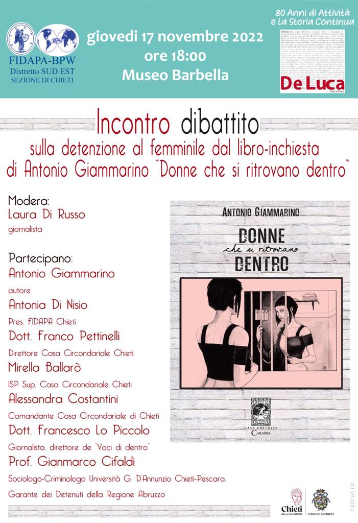 Parteciperanno all’incontro, oltre all’autore del libro, la presidente della Fidapa di Chieti Antonia Di Nisio, il direttore della casa circondariale di Chieti Franco Pettinelli, la comandante della casa circondariale Alessandra Costantini, l’ispettrice superiore del carcere di Chieti Mirella Ballarò, il presidente dell’associazione di volontariato “Voci di dentro” Francesco Lo Piccolo, il sociologo-criminologo dell’Ateneo “Gabriele D’Annunzio” e garante dei detenuti della Regione Abruzzo Gianmarco Cifaldi. Modera la giornalista Laura Di Russo.