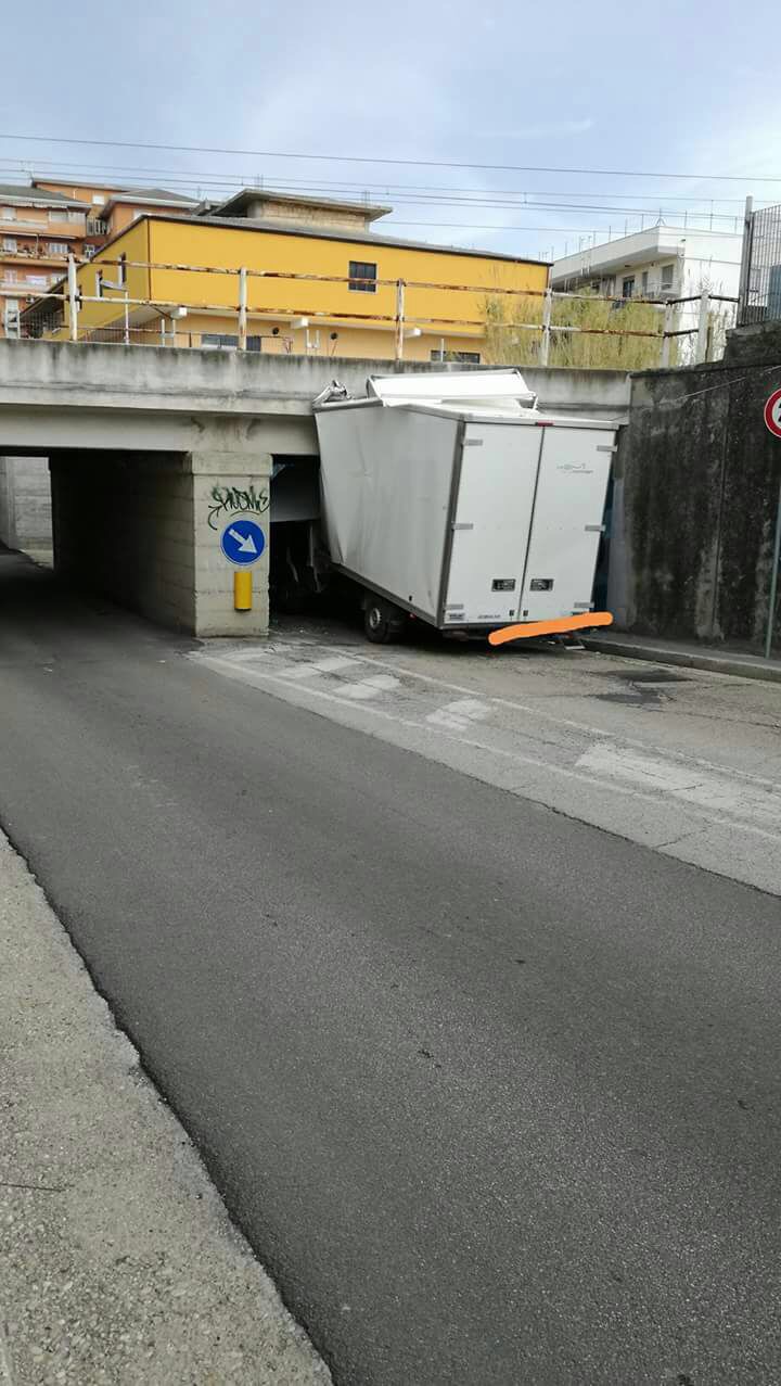 Chieti: un furgone é rimasto incastrato al sottopasso della ferrovia in via Enrico Mattei a Chieti Scalo.