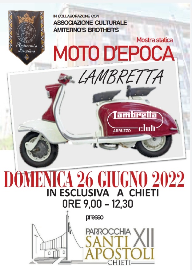 Domenica 26 giugno, in esclusiva a Chieti, dalle ore 9 alle 12:30, nella parrocchia Santi XII apostoli, si terrà la mostra statica delle moto d’epoca della lambretta. Si tratta di un evento dedicato ai tanti appassionati dello scooter che ha segnato un’epoca della storia italiana e non solo visto che saranno presenti veicoli provenienti da tutta la penisola e da tutto il continente europeo.