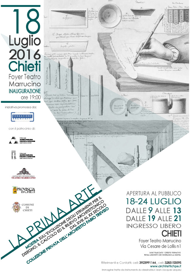Chieti: La Prima Arte in Mostra al Marrucino, presso il Foyer del teatro da oggi fino a domenica in un’esposizione dedicata all’evoluzione degli strumenti per il disegno, il calcolo e il rilievo architettonico dal XVIII al XX secolo.