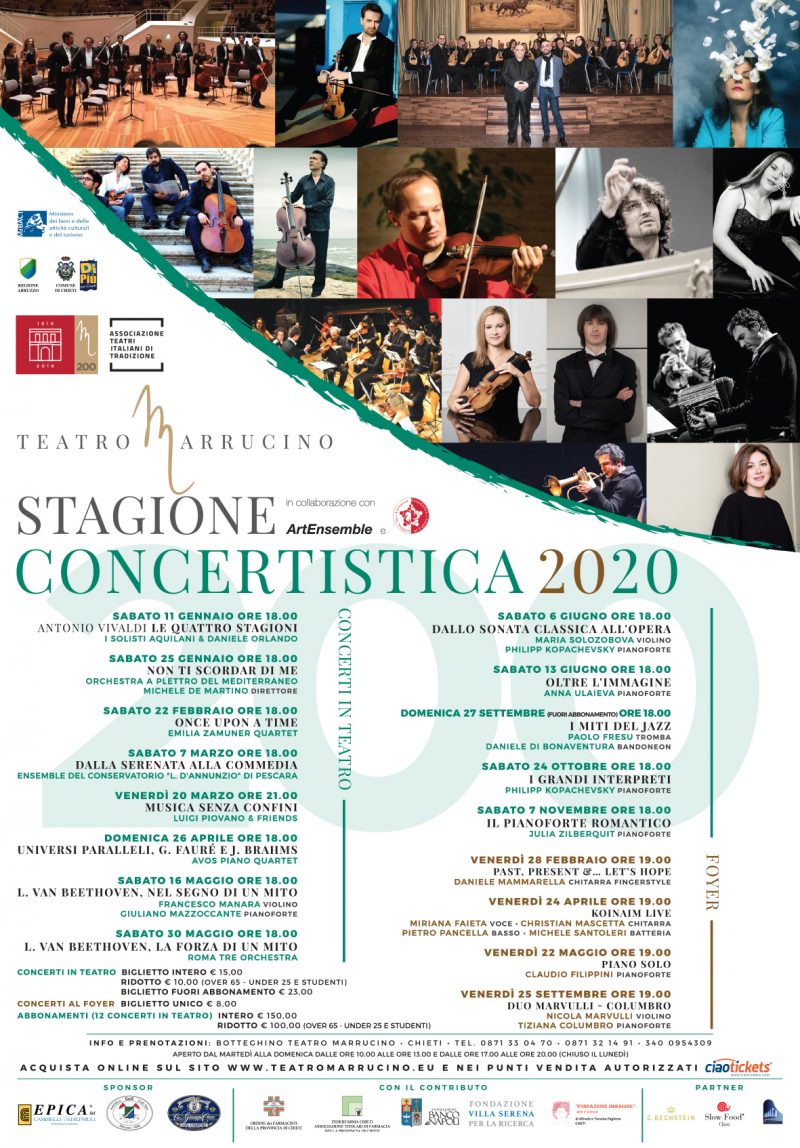 Saranno artisti di fama internazionale e musicisti abruzzesi i protagonisti dei concerti di musica classica e jazz di scena al teatro Marrucino di Chieti dall’11 gennaio al 7 novembre nell’ambito della stagione concertistica 2020.