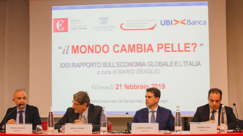 Si è svolta a Chieti, ieri 21 febbraio, presso il Centro Direzionale UBI Banca di via Colonnetta, la presentazione di ”Il mondo cambia pelle?”, a cura del prof. Mario Deaglio, che analizza i trend macroeconomici e le dinamiche geopolitiche degli ultimi dodici mesi, con uno sguardo specifico al ruolo che l’Italia può assumere nell’attuale congiuntura economica e in relazione alle dinamiche internazionali. L’incontro fa parte di una serie di eventi, iniziata lo scorso 21 gennaio con la presentazione del Rapporto a Milano, che toccherà varie città d’Italia per concludersi a Roma il prossimo giugno.