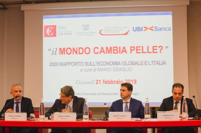 Si è svolta a Chieti, ieri 21 febbraio, presso il Centro Direzionale UBI Banca di via Colonnetta, la presentazione di ”Il mondo cambia pelle?”, a cura del prof. Mario Deaglio, che analizza i trend macroeconomici e le dinamiche geopolitiche degli ultimi dodici mesi, con uno sguardo specifico al ruolo che l’Italia può assumere nell’attuale congiuntura economica e in relazione alle dinamiche internazionali. L’incontro fa parte di una serie di eventi, iniziata lo scorso 21 gennaio con la presentazione del Rapporto a Milano, che toccherà varie città d’Italia per concludersi a Roma il prossimo giugno.