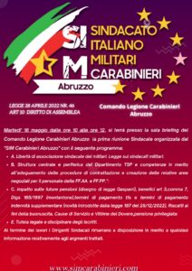 Martedi 16 maggio a Chieti il “SIM Abruzzo” terrà ufficialmente la prima assemblea sindacale regionale che sarà ospitata dalla sala briefing del Comando Regione Carabinieri Abruzzo e Molise