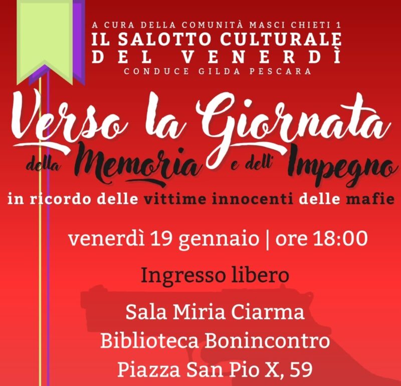 Venerdì 19 gennaio, alle ore 18,00 alla Biblioteca “Bonincontro” il Salotto Culturale del Venerdì, curato dalla Comunità Masci Chieti 1, proporrà un incontro di particolare attualità ed interesse: “Insieme verso la giornata della memoria e dell’impegno, in ricordo delle vittime innocenti delle mafie”