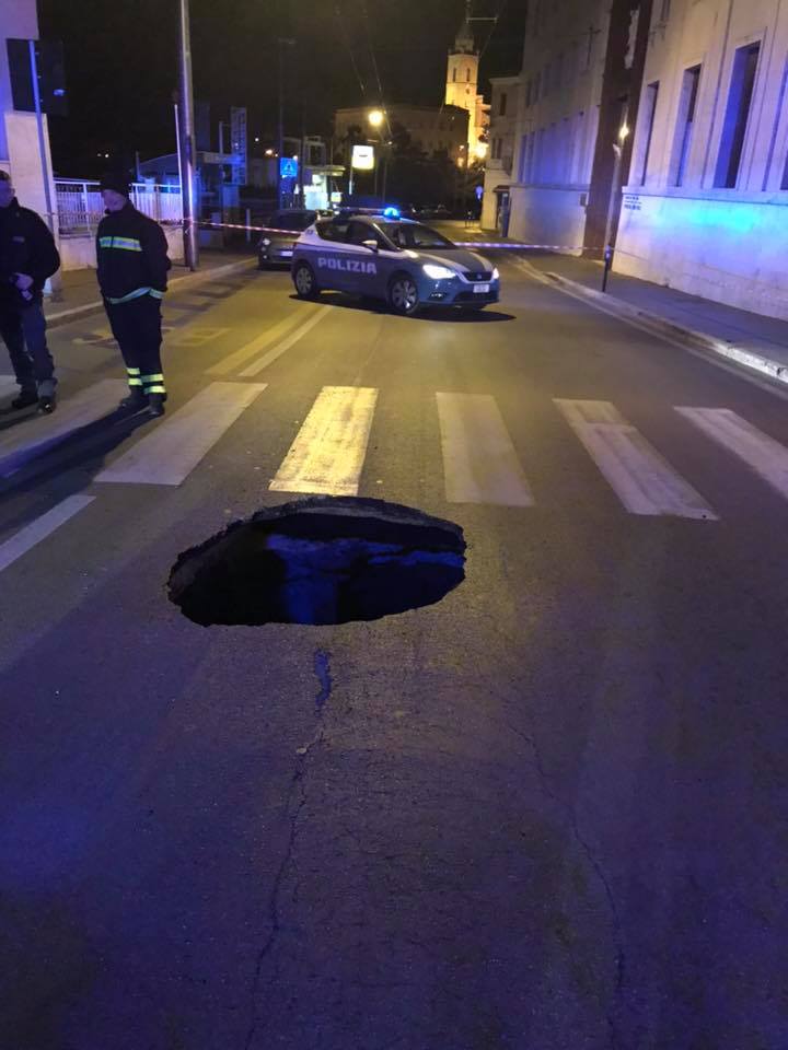 Intanto ieri sera a documentare l’accaduto sui social con tanto di foto è stato lo stesso sindaco Umberto Di Primio, giunto sul posto dopo qualche minuto. Immediato anche l’intervento di Polizia, Vigili del Fuoco e Polizia Municipale. La buca, profonda tre metri e larga un metro e mezzo, si è aperta a poca distanza dalle strisce pedonali. Il sindaco ha contattato subito l’unico operaio a disposizione, Marco Di Gregorio, per sistemare alcune transenne.