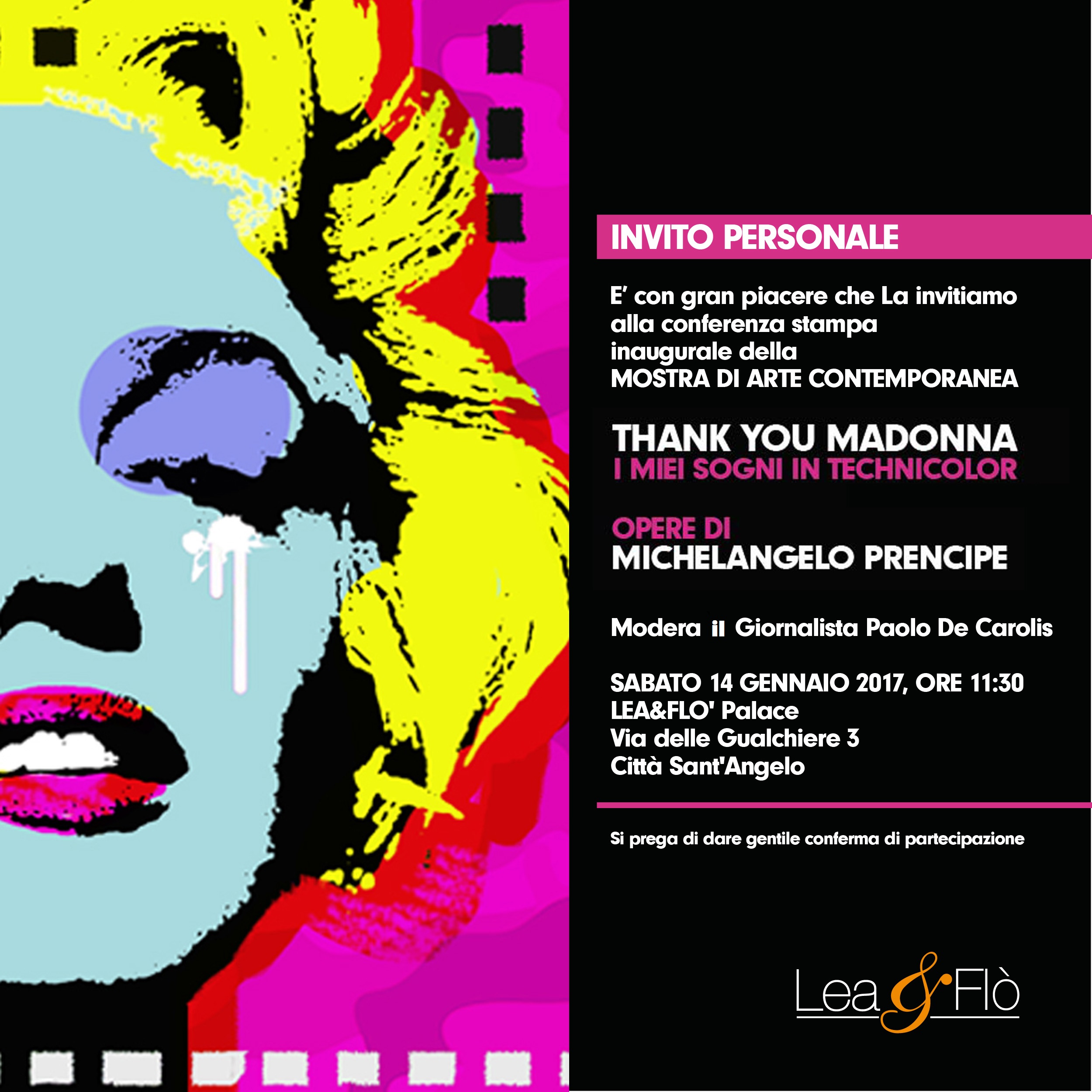 Omaggio alla regina del Pop Madonna, al secolo Madonna Louise Veronica Ciccone, dell’artista Michelangelo Prencipe in una mostra a Città Sant’Angelo. Madonna ha scelto una delle opere da lui realizzate per le immagini backdrop che scorrono sullo schermo del suo ultimo tour mondiale, il “RebelHeart Tour”. Prencipe nelle sue opere, in mostra presso Lea &Flò Palace, con ingresso gratuito,racconta l’energia POP in technicolor, icone, ‘influencer’ contemporanei, VIP, personaggi dello star system, idoli del passato, con l’ausilio di grafica, colore, ironia, sagacia. Essere stato notato da una Star di fama internazionale che è da sempre sulla cresta dell’onda per la sua capacità di interpretare i gusti e i sentimenti di generazioni in costante mutamento, rivela lo spessore e l’abilità che Prencipe apre sul futuro dell’advertising in chiave artistica.
