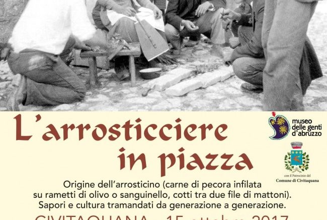 La festa era quella dell’ Arrosticiere in piazza e rappresentava un momento di celebrazione religiosa, ma anche di semplice convivialità, per i pastori transumanti, considerati a ragione gli inventori dell’arrosticino tipico abruzzese, che sostavano per qualche giorno nell’area Vestina al confine con il Parco Nazionale del Gran Sasso. Proprio in questa zona, nell’autunno del 1930, a Civitaquana, sarebbe stata scattata la prima foto che immortala la cottura di un arrosticino da due documentaristi e storici svizzeri, Paul Scheuermeier e Gerhard Rohlfs. A tal proposito, si legge nella nota di commento alla foto nel libro: