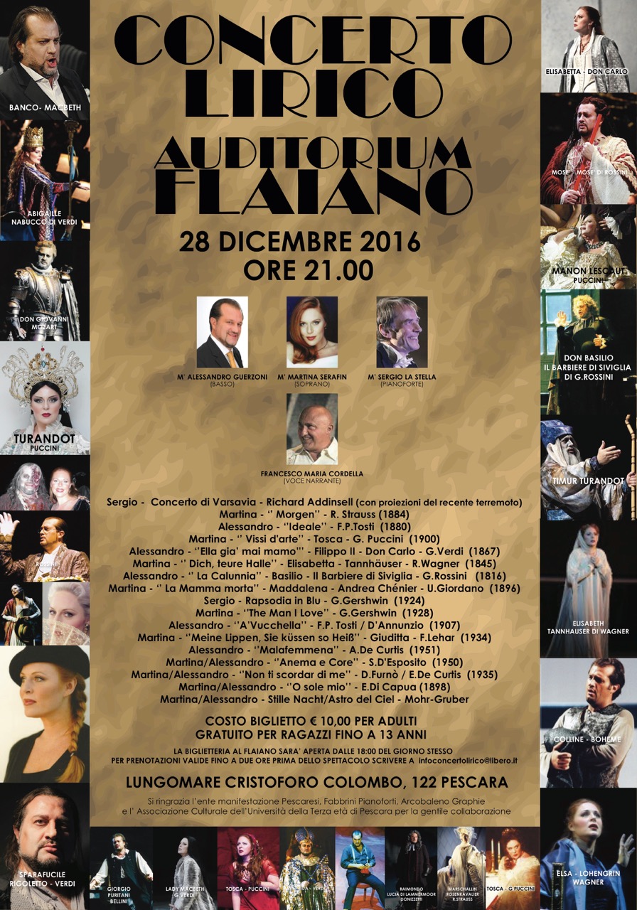 Un concerto lirico, alle ore 21 del 28 dicembre all’auditorium Flaiano di Pescara, che vedrà protagonisti sul palco il soprano di origine veneto-austriaca Martina Serafin e il basso Alessandro Guerzoni accompagnati al pianoforte dal maestro Sergio La Stella. I maestri Serafin e Guerzoni, dopo aver calcato palcoscenici in teatri di tutto il mondo, hanno deciso di organizzare una serata dedicata alla musica di qualità ma anche all’arte fotografica, pittorica e figurativa. Prima dell’esecuzione dei brani del ricco e variegato programma del concerto l’attore Francesco Maria Cordella sarà la voce narrante che descriverà al pubblico le loro peculiarità. Saranno proiettate immagini realizzate dai professori Gino Di Paolo , pittore, scenografo e curatore delle immagini e Nicola Costanzo, pittore, incisore xilografo, saggista e fotografie del terremoto a Norcia scattate da Paolo Tosti. Il costo del biglietto è di 10 euro.