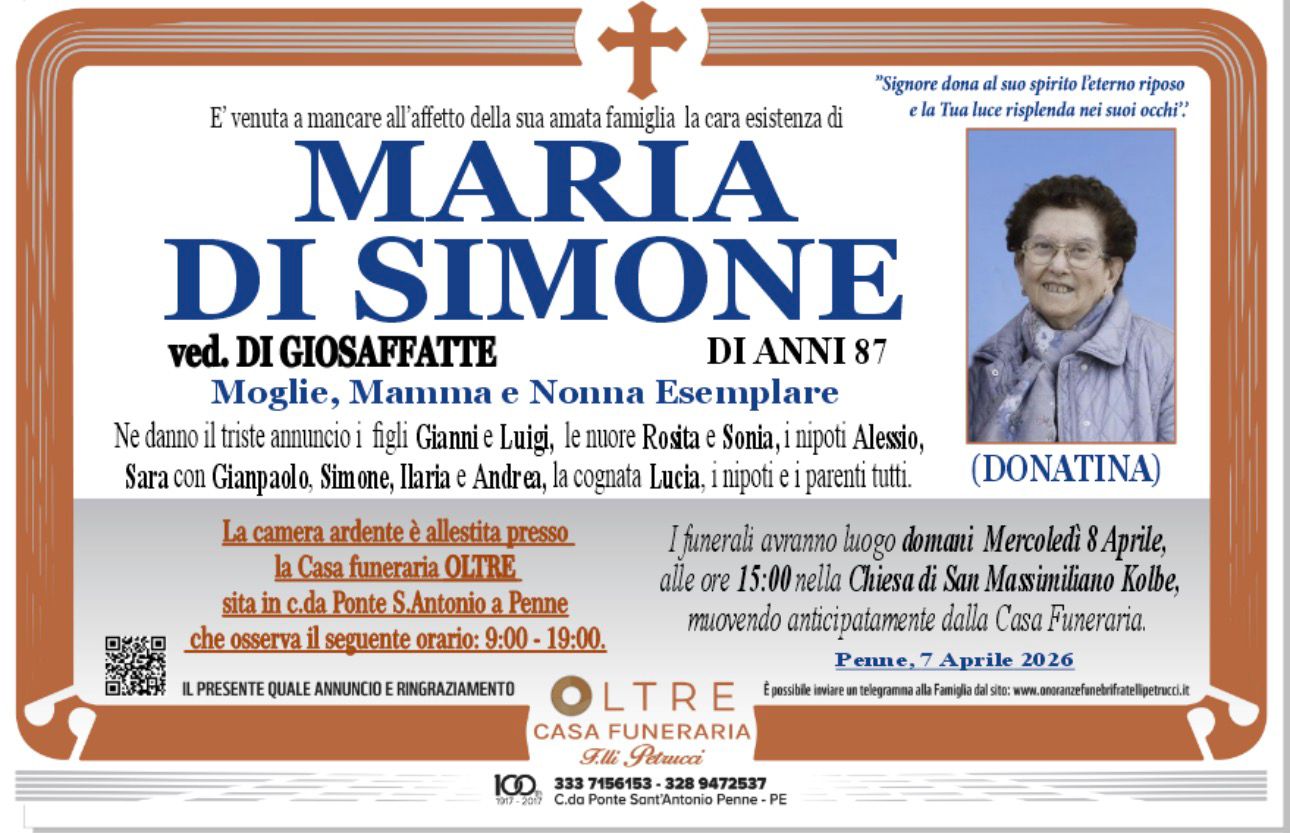 A tre mesi dalla morte del padre Salvatore è mancata anche la mamma del professore Luigi Di Giosaffatte: Maria De Simone, 87 anni. Oggi pomeriggio, alle ore 15, i funerali saranno celebrati nella chiesa di San Massimiliano Kolbe a Penne.