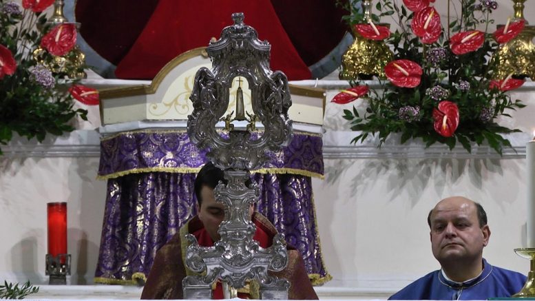 Il parroco don Domenico Spagnoli ha compiuto questo atto di fede nella chiesa in cui viene conservata la sacra reliquia e nel giorno nel quale la città la venera: il venerdì che precede la Settimana Santa. La Sacra Spina appartiene alla classe delle cosiddette “reliquie per contatto” (brandea) relative alla corona di Cristo è concessa tra il febbraio 1562 e il marzo 1563 dal pontefice Pio IV al marchese del Vasto Ferrante Francesco II d’Avalos.