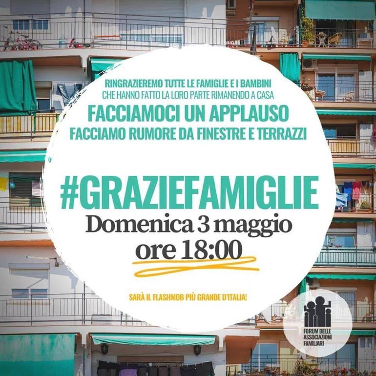 Il flash-mob è previsto per domani, 3 maggio, alle ore 18, e il Forum abruzzese delle associazioni familiari invita tutti ad affacciarsi e ad applaudire e ringraziare, ciascuno a suo modo e con il proprio stile: genitori, bambini e nonni i quali, non uscendo di casa, hanno dato un contributo decisivo al bene comune.
