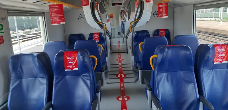 Sui treni regionali le distanze di sicurezza sono garantite con marker rossi sui sedili non utilizzabili. Inoltre le porte di entrata e quelle di uscita dai treni, indicate da apposita segnaletica, sono separate per evitare incroci tra i viaggiatori. Non è consentito viaggiare in piedi.