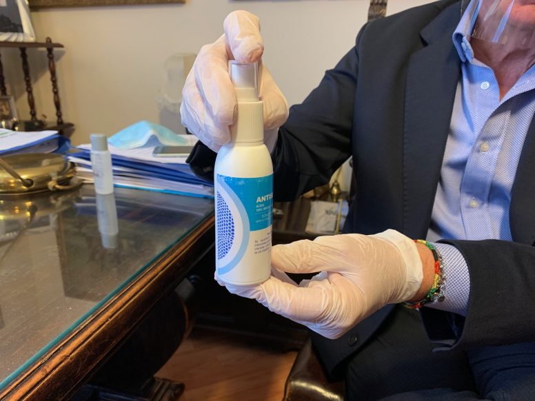 “La particolarità di questo prodotto sta nella sua bivalenza – spiega Berghella mentre utilizza lo spray sulla sua bocca, sul naso e negli occhi – ovvero non è in alcun modo nocivo per il corpo umano. Si tratta di certificare scientificamente la sua efficacia nel tempo che in teoria non dovrebbe essere inferiore alle 5 ore e non superiore alle 8. Questo significa che basterebbe uno spray per dotarci di una sorta di “scudo” che ci tiene a riparo da virus e batteri e tornare così alla vita di tutti i giorni.”