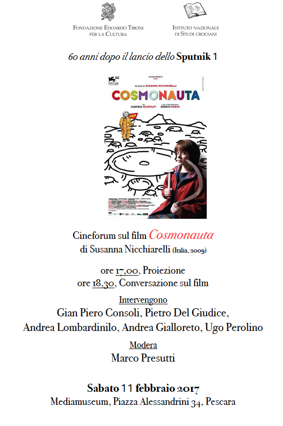 “Cosmonauta” ,il film realizzato nel 2009 da Susanna Nicchiarelli, sarà proiettato sabato prossimo alle ore 17 al Mediamuseum di Pescara. Una iniziativa della Fondazione Edoardo Tiboni per la cultura e dell’Istituto nazionale di Studi crociani. Dopo la visione, alle 18,30, ci sarà una conversazione sui temi del film e sul clima culturale, storico e politico di quegli anni con interventi di Gian Piero Consoli, Andrea Lombardinilo, Andrea Gialloreto e Ugo Perolino. Parteciperà anche Pietro Del Giudice, che nel Cosmonauta ha interpretato il ruolo di Arturo, il fratello della protagonista del film, Luciana. L’incontro sarà moderato da Marco Presutti.