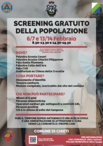 L’Amministrazione comunale di Chieti e la Asl Lanciano Vasto Chieti, alla luce dell’aumento di casi di positività al Covid-19 nel capoluogo teatino, in particolare della variante inglese, invitano i cittadini a sottoporsi, nei prossimi due fine settimana, agli screening antigenici di massa.
