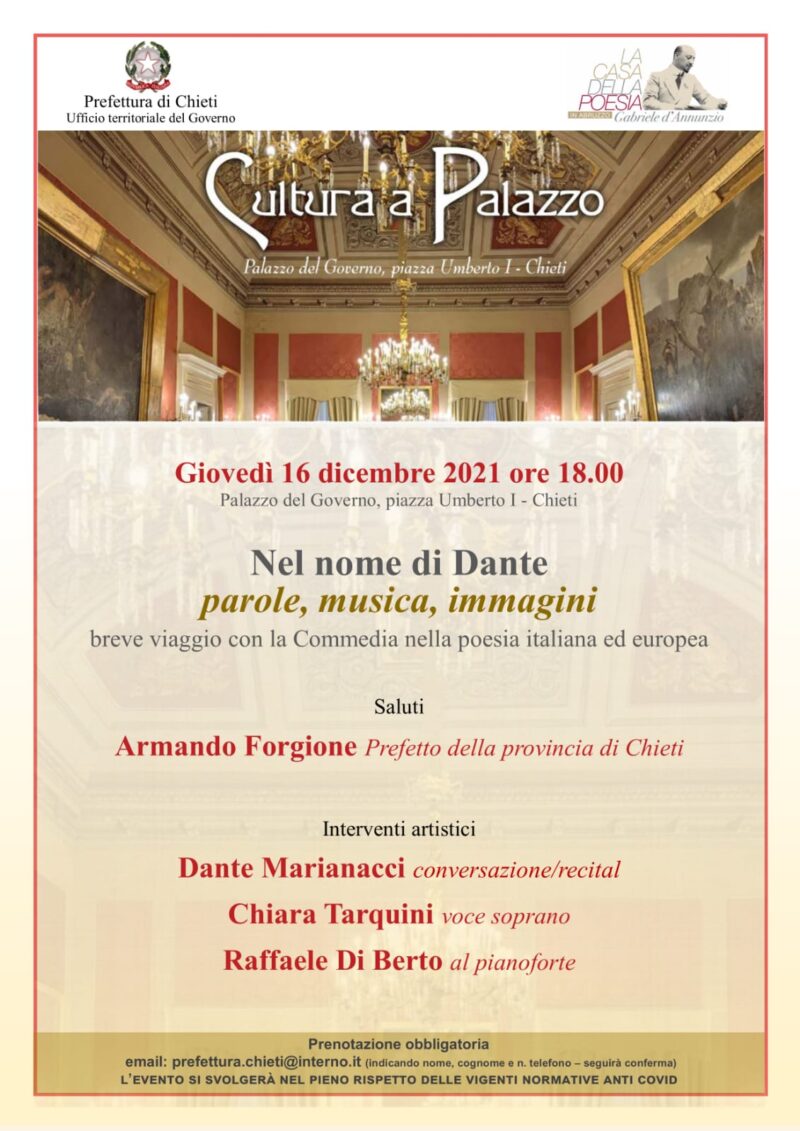 Domani, giovedì 16 dicembre, alle ore 18, in prefettura a Chieti si terrà l’evento artistico “Nel nome di Dante, parole, musica, immagini: breve viaggio con la Commedia nella poesia italiana ed europea” che vedrà protagonisti lo scrittore Dante Marianacci, il soprano Chiara Tarquini e il pianista Raffaele Di Berto.