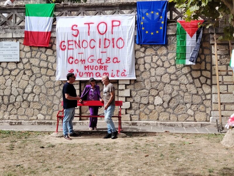 Iniziativa ieri mattina nella centralissima piazza Alfidi a Luco dei Marsi tra installazioni, bandiere e messaggi. La sindaca Marivera De Rosa: “Contro il genocidio in atto a Gaza, solidarietà al popolo palestinese”.
