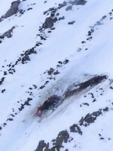 Ieri giornata intensa per tutte le persone impegnate nelle ricerche nel corso delle quali un gatto delle nevi battipista è stato sganciato dall’elicottero che lo stava trasportando, per motivi di sicurezza dell’equipaggio, ed è precipitato. (foto in basso)