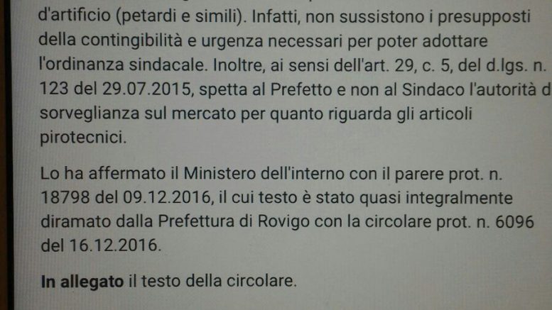Divieto botti di fine anno: ordinanze comunali illegittime, lo certifica un parere del Ministero degli Interni recepito dalla Prefettura di Rovigo.