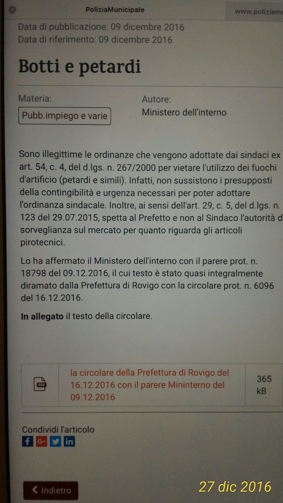 Questo il testo integrale del parere del Ministero protocollo n°18798 dello scorso 9 dicembre, il cui testo é stato quasi integralmente diramato dalla Prefettura di Rovigo con la circolare n° 6096 del 16 dicembre. Ordinanze, dunque, che hanno il valore della carta straccia, se non fosse per il fatto che molti operatori commerciali del settore vengono comunque danneggiati, come se il mercato dei botti illegali, che rappresenta già una pesante minaccia per coloro che agiscono nel pieno rispetto delle normative, non provocherebbe già abbastanza guai ad un settore che vive principalmente grazie a periodi come questi.