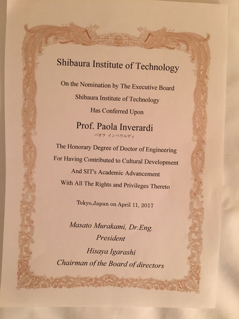 In una nota dell’Ateneo aquilano si legge che il “riconoscimento alla Rettrice Paola Inverardi è il coronamento di un intenso e proficuo rapporto istituzionale di lunga durata tra l’Università degli Studi dell’Aquila e lo Shibaura Institute of Technology (SIT). I primi contatti con l’Istituzione giapponese, si ebbero già a partire dal 1993 con la stesura di una prima convenzione per attività di ricerca nel campo dell’Ingegneria meccanica e meccatronica promossa dal prof. Pierluigi Beomonte Zobel e dal prof. Hiroyasu Funakubo. A questa prima convenzione ne è seguita una bilaterale, sotto la responsabilità scientifica del prof. Terenziano Raparelli e del prof. Takashi Komeda, che prevedeva un interscambio di studenti tra l’Ateneo aquilano e lo Shibaura Institute of Technology. Ma il rapporto tra le due Istituzioni si è rafforzato qualche anno dopo con l’aggiunta della convenzione nel campo dell’Architettura promossa dal prof. Hiromi Fujii e dal prof. Romolo Continenza, operativa dal 2001. Dal 2002 hanno luogo i workshop di architettura in Italia e in Giappone e coinvolgono, per la durata di un mese, dieci studenti italiani e dieci giapponesi organizzati in cinque gruppi misti. L’appassionato lavoro del prof. Romolo Continenza e dei molti colleghi e collaboratori ha permesso il raggiungimento di questo ambìto riconoscimento per l’Università dell’Aquila”.
