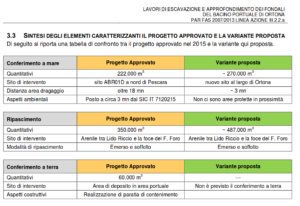 -la restante parte, ben 270.000 mc, verrebbe scaricata in mare di fronte al porto di Ortona in un sito diverso rispetto a quello, vicino all’Area Marina Protetta di Cerrano, che fu causa della precedente bocciatura del progetto.