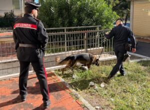 I militari operanti, nel corso di perquisizione domiciliare eseguita nell’abitazione del predetto con l’ausilio del nucleo carabinieri cinofili di Chieti, rinvenivano: un panetto confezionato di hashish quantificato in gr. 107; 3 involucri di cocaina del peso complessivo di gr. 1,8 e un bilancino di precisione.