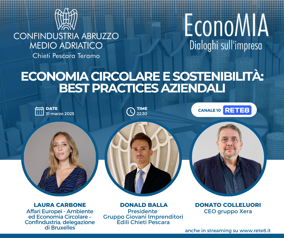 Economia circolare e sostenibilità: best practices aziendali: questo il titolo della puntata di “EconoMIA, dialoghi sull’impresa”, format tv di Confindustria Abruzzo Medio Adriatico e Rete8 che andrà in onda lunedì 31 marzo alle ore 22:30