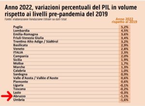 Il dato emerge da uno studio della Fondazione Edison basato sui dati Istat del 2022 e riferito alla variazione del PIL in volume rispetto al periodo pre-pandemia (2019. Il deputato D’Alfonso in una nota evidenzia che “soltanto l’Umbria ha avuto un rendimento peggiore (-1,6%). Dunque siamo scivolati indietro e, guarda caso, questo arretramento è avvenuto proprio da quando la giunta regionale è in mano al centrodestra”.