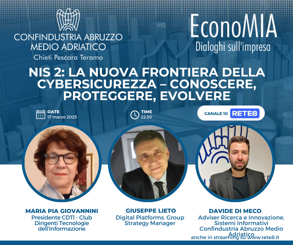 NIS 2: la nuova frontiera della cybersicurezza – conoscere, proteggere, evolvere. Questo il titolo della puntata di “EconoMIA, dialoghi sull’impresa”, format tv di Confindustria Abruzzo Medio Adriatico e Rete8 che andrà in onda lunedì 17 marzo alle ore 22:30
