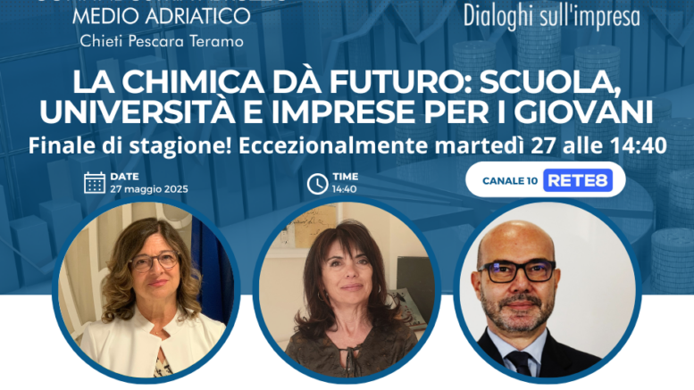 La chimica dà futuro: scuola, università e imprese per i giovani. Questo il titolo della puntata di “EconoMIA, dialoghi sull’impresa”, format tv di Confindustria Abruzzo Medio Adriatico e Rete8 che andrà in onda come finale di stagione eccezionalmente martedì 27 maggio alle ore 14:40