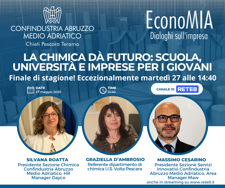 La chimica dà futuro: scuola, università e imprese per i giovani. Questo il titolo della puntata di “EconoMIA, dialoghi sull’impresa”, format tv di Confindustria Abruzzo Medio Adriatico e Rete8 che andrà in onda come finale di stagione eccezionalmente martedì 27 maggio alle ore 14:40