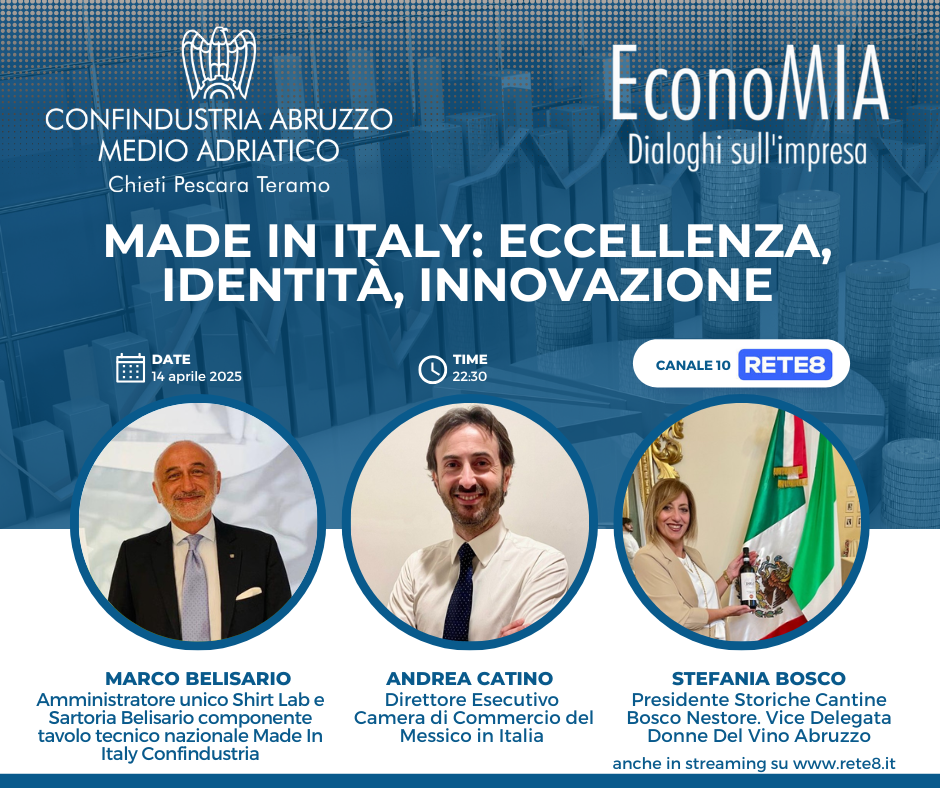Made in Italy: eccellenza, identità, innovazione: è il titolo della puntata di “EconoMIA, dialoghi sull’impresa”, format tv di Confindustria Abruzzo Medio Adriatico e Rete8 che andrà in onda domani 14 aprile 2025 alle ore 22:30