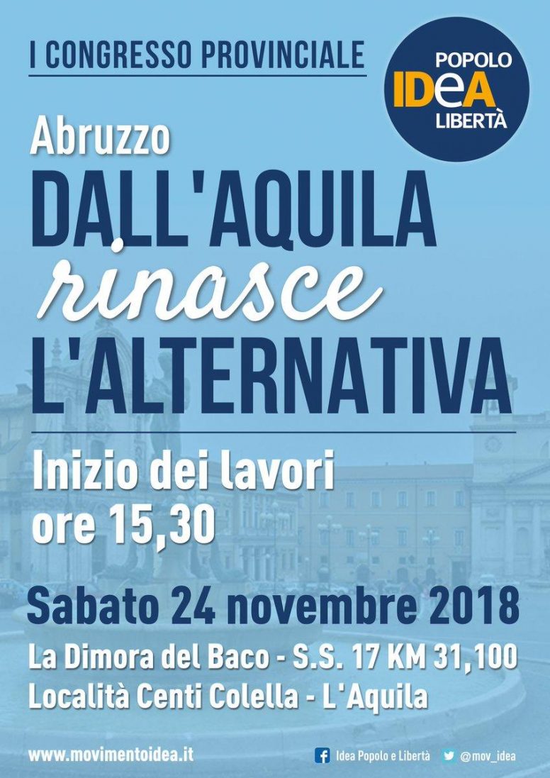 Il congresso dal titolo “Abruzzo – Dall’Aquila rinasce l’alternativa” si terrà, a partire dalle ore 15.30, all’hotel Dimora del Baco e duranti i lavori eleggerà gli organi statutari e chiamerà a raccolta i quadri del partito da tutto il territorio aquilano.