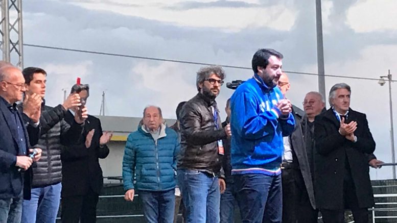 Salvini, intanto, sul palco parla dei risultati ottenuti con gli sbarchi azzerati, gli oltre 100 mila italiani che hanno già aderito a Quota 100 e la legge sulla legittima difesa e sulle amministrative in Abruzzo: