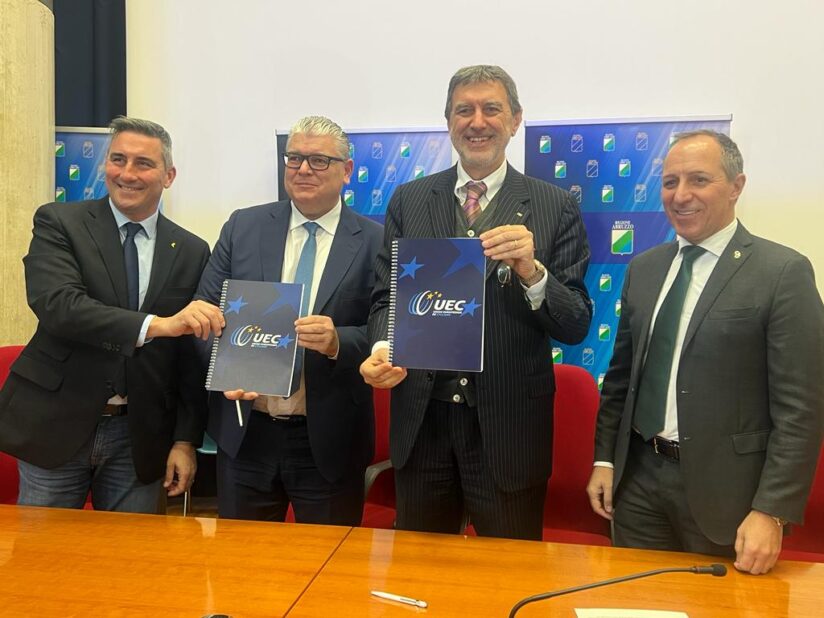 Firma della convenzione che consentirà di portare in Abruzzo gli Europei di Ciclismo del 2029. Una data simbolo che arriva a venti anni dal terremoto de L’Aquila