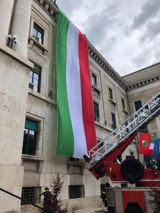 Questa sera, in piazza Italia, davanti al palazzo della prefettura di Pescara, durante il concerto dell’orchestra del conservatorio “Luisa D’Annunzio”, in occasione della festa della Repubblica che sarà celebrata domani 2 giugno, mentre veniva eseguito l’inno nazionale, i Vigili del Fuoco del Comando provinciale di Pescara, coordinati dal comandante Vincenzo Palano, hanno provveduto a srotolare una grande bandiera tricolore, lungo la facciata del Palazzo del Governo e della Provincia .