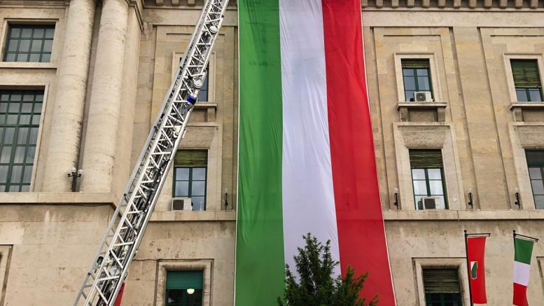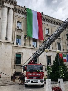 In occasione della Festa della Repubblica i Vigili del Fuoco hanno srotolato una grande bandiera tricolore sulla facciata del palazzo del Governo e della Provincia in piazza Italia a Pescara.