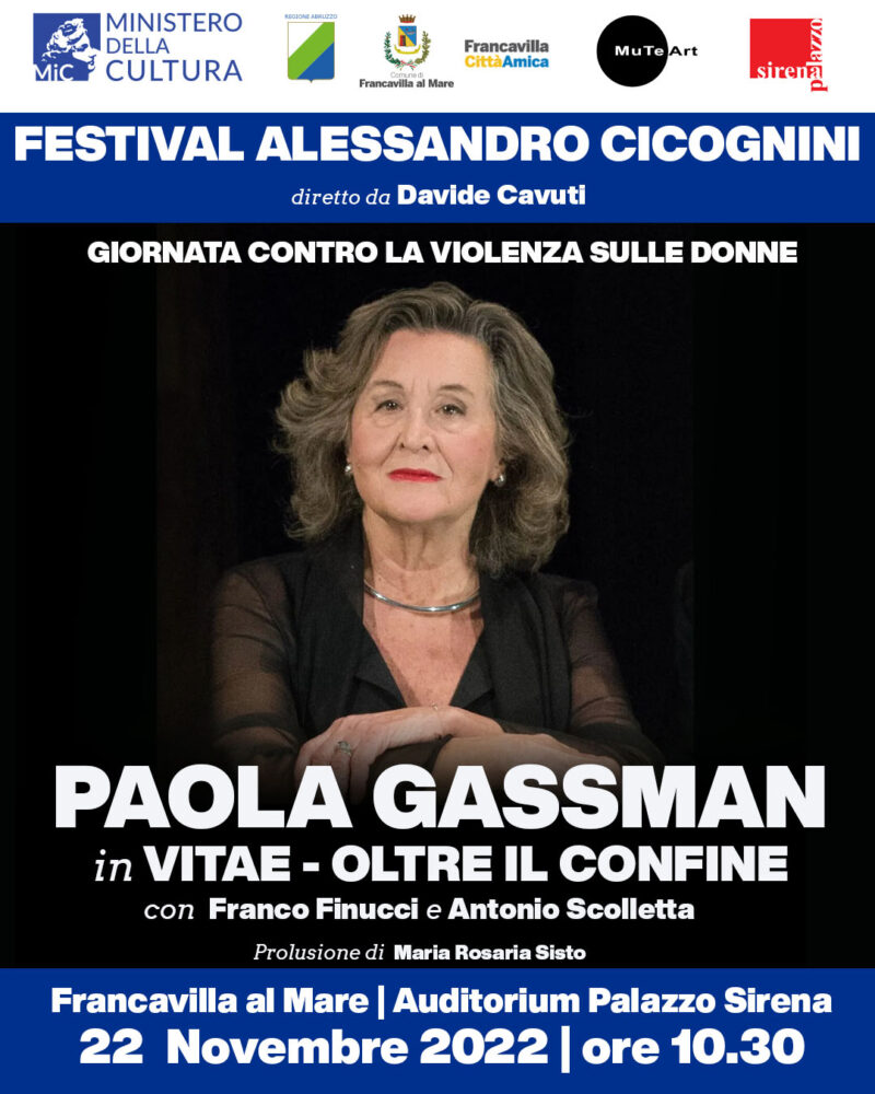 Paola Gassman sarà sul palco insieme ad Antonio Scolletta e a Franco Finucci domani 22 novembre, alle ore 10:30, con lo spettacolo “Vitae – Oltre il confine”, prodotto dall’Associazione Culturale MuTeArt. Lo spettacolo si inserisce negli eventi in occasione della “Giornata internazionale contro la violenza sulle donne”, e vedrà l’intervento di Maria Rosaria Sisto, presidente dell’Associazione “Le Franche Villanesi”>.