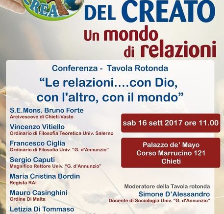 Dibattiti e spettacoli, workshop, laboratori, attività di piazza, fino a domenica 17 settembre, a Chieti, in occasione del ‘Festival del Creato – un Mondo di relazioni’. “Relazioni ” è, infatti, il tema intorno al quale ruota la seconda edizione del Festival, nato un anno fa su iniziativa dell’Ordine francescano secolare d’Abruzzo e dei Frati minori conventuali d’ Abruzzo e Molise, coadiuvati dalla Consulta dei laici di Chieti e supportati dall’ Arcidiocesi di Chieti-Vasto. Dialogo intorno al pensiero di San Francesco d’Assisi fondato sui valori di fraternità, umiltà, carità e pace, universalmente riconosciuto “amico della natura” e di tutte le realtà create da Dio. La manifestazione francescana fa parte del circuito OFF del più longevo “Festival Francescano” di Bologna e già nel 2016 nella sua prima edizione ha affrontato un tema delicato e attuale, ragionando sull’Ecologia integrale promossa dall’Enciclica “Laudato sii” di Papa Francesco. Tra i tanti relatori delle numerose conferenze ospitate da palazzo De Mayo: l’Arcivescovo Metropolita di Chieti-Vasto , monsignor Bruno Forte e il professor Vincenzo Vitiello, già ordinario di Filosofia Teoretica, attualmente Docente di Teologia Politica presso l’Università San Raffaele di Milano, il prof Francesco Ciglia, Ordinario di Filosofia Morale dell’Università di Chieti-Pescara. Monsignor Forte ha ribadito l’importanza del rispetto della Natura ed invitato tutti, i giovani in particolare, a non compiere atti che la danneggiano e la deturpano.