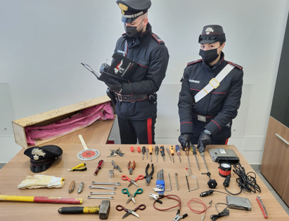 I militari li hanno sottoposti a perquisizione personale e veicolare e hanno trovato nel vano posteriore dell’auto numerosi arnesi da scasso (nella foto). I carabinieri hanno sequestrato anche una centralina utilizzata per l’accensione di autovetture che era stata nascosta in un lenzuolo.