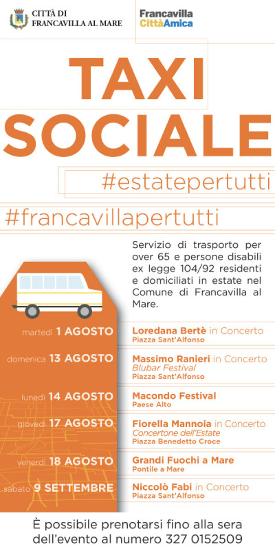 Il Comune fa sapere che il servizio di taxi sociale è rivolto a uomini e donne con età superiore ai 65 anni o a persone diversamente abili che vivono in una condizione di parziale o totale assenza della rete familiare. L’accesso potrà avvenire previa prenotazione, al numero 327.0152509. Il calendario (in allegato) prevede questa possibilità anche per altri eventi di questa Estate.