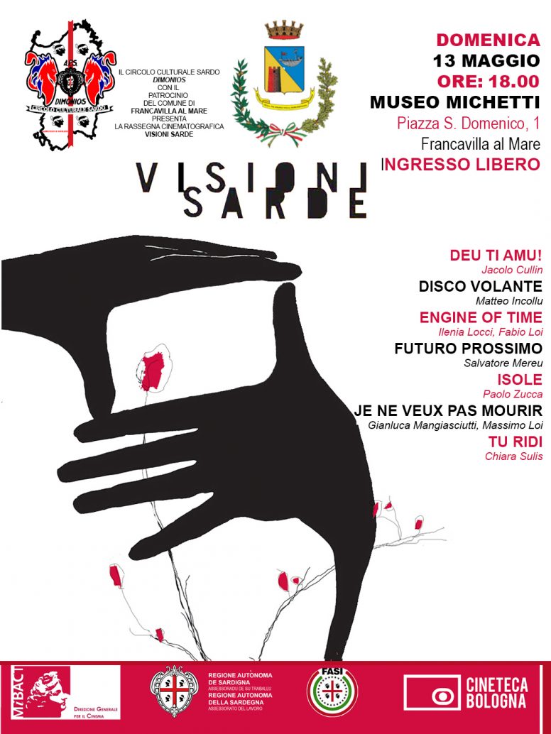 A Francavilla al Mare (Chieti), domenica 13 maggio 2018, dalle ore 18.00, presso Museo Michetti (Piazza San Domenico 1), l’ A.P.S. “Dimonios” – Circolo Culturale Sardo Abruzzo e Molise, con il patrocinio del Comune di Francavilla al Mare, organizza la proiezione, con ingresso libero, di sette degli otto film finalisti (preselezionati dagli esperti della Cineteca di Bologna) del concorso “Visioni Sarde – I corti in circolo nei circoli” edizione 2018: DEU TI AMU! di Jacopo Cullin; DISCO VOLANTE di Matteo Incollu; ENGINE OF TIME di Ilenia Locci, Fabio Loi; FUTURO PROSSIMO di Salvatore Mereu; ISOLE di Paolo Zucca; JE NE VEUX PAS MOURIR di Gianluca Mangiasciutti, Massimo Loi; TU RIDI di Chiara Sulis; Interverrà Giacomo Ganzu, Vice Coordinatore Nazionale Giovani della F.A.S.I. (Federazione delle Associazioni Sarde in Italia). A sostegno dell’iniziativa Il Circolo Sardi Dimonios: